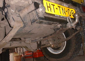 De achterkant. De ''paal'' met daarop de extra achteruitrijlamp en de 27 MC antenne. Zelfgemaakt van RVS en bevestigd op de eveneens RVS achterdeur scharnieren. |