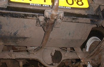 | De voorkant. Hier zie je de lier, pushbar en bumper. De lier is gemonteerd op de originele lierplaat door middel van zelfgemaakte steunen waardoor hij een kwart slag gedraaid word. Dit heb ik gedaan omdat hij dan minder te lijden heeft van modder en zand. De relais zijn onder de motorkap gemonteerd en de aansluiting van de afstandsbediening onder het dashboard. De bumper is zelf gemaakt van dikke buis in combinatie met lasbochten. De pushbar is een originele RVS samurai pushbar. Alleen is de stand veranderd anders kwam het niet uit met de lier. |