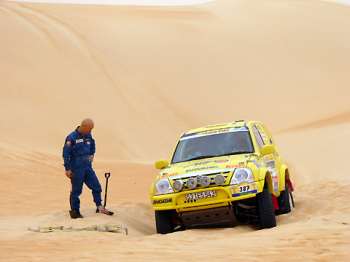 15 februari - Dakar Foto's gestuurd door Henri. De Grand vitara deed het niet zo goed. Op de ene foto zit hij vast en op de andere staat hij in brand....