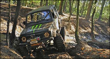 18 Oktober - Foto's gestuurd door Patrick van zijn monster: Motor 1.6 - 16V. 6.1 tussenbak van D&G. Heavy duty spidertrax tussenbaksteun met poly-bushings als ophanging. Nisan patrol assen voor C220, achter H233 met lsd. Gereviseerd remsysteem. Hoofdremcylinder van een Range Rover. SPOA met aangepaste casterhoek en stuurstang. 3" trailmaster bladveren met poly urethaan bushings. Trailmaster stage II schokbrekers. 33"x12,5x16 blackstar Mudmax banden op 16" x 10J lada niva velgen. Stuurbekrachtiging van een vitara. Bushwackers. Custom made lierbumper en heavy duty sidebars van 10 x 10 cm. T-max 8500 lb lier met dyneema liertouw en aluminium fairlead. Led- knipperlichten in zijscherm en op lierbumper. Angel-eyes. 2e accu, Exide met scheidingsrelais en 35 mm2 voedingskabels. Compleet gerestaureerde body en bodem. Binnenkant bekleed met traanplaat panelen. Verstelbare kuipstoelen met 4-puntssluiting.