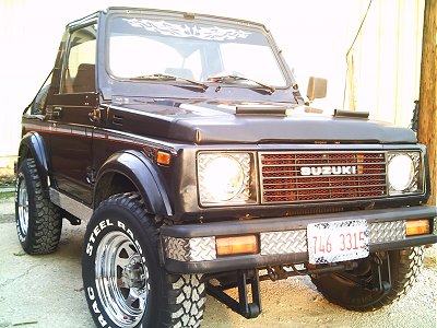 4 september - Ik heb een nieuwe "servicewagen" Een zwarte (spanish shit) samurai van december 93, met 125.000 km op de teller. Opties: trekhaak, bullbar, een paar supermarkt deukjes, van mijn zus geleende radio, mud maniac sticker, roestige bumper en een jimny wielhoes :-)