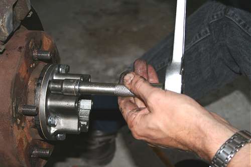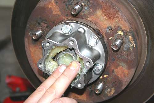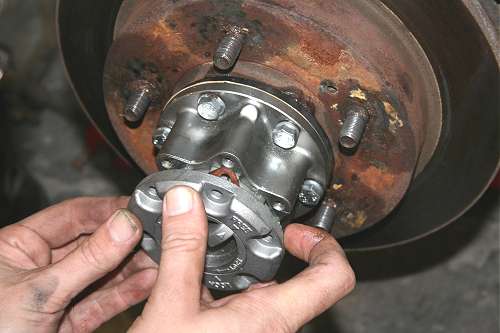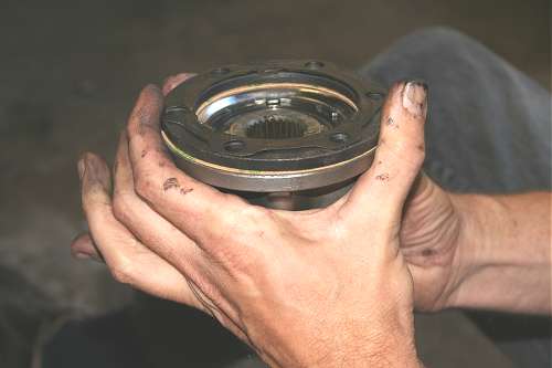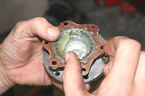 Zo heb ik er de nieuwe naaf opgezet. Van onder naar boven: het onderste deel van de vrijloopnaaf, pakking, opvulring en de jimny pakking. |