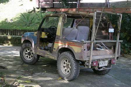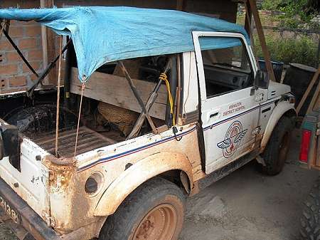 De volgende coole modificatie komt van John Smith Junior. Hij woont in modificatie land number one: The ustates nights of Amerika! Hij vertelt dat wij het allemaal verkeerd zien, het gaat niet om lagere gearing maar om POWER. Dus schroefde hij de zielige 1300 uit zijn samurai en bouwde er een 17 liter V8 met 13 screaming holley 4 barrel carburateurs erin. Nadelen zijn er niet zoveel volgens hem, in het land van de onbegrensde mogelijkheden hebben ze geld, benzine, chroom en steekassen genoeg! Zijn sam heeft nu iets van 850 PK en dat vindt hij nog aan de krappe kant. Zijn volgende project moet toch minstens het dubbele aantal PK's hebben. |