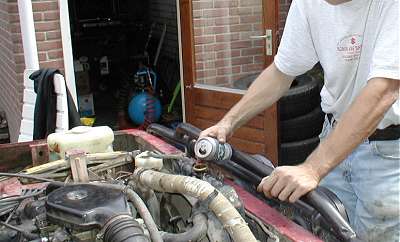 Ard rijd een sidekick, oftewel in het Nederlands: een vitara. Omdat je dan al gauw als verwijfd of niet voor vol aangezien word deed hij de modificatie op de foto. Via connecties in het buitenland wist hij in Brazilië dit uitlaat eind stuk op de kop te tikken. Het is gemaakt van Zuid Amerikaans roestvrijstaal. Hand gemaakt door Pablo Homo Kinetica en gepolijst door Pedro Erpo & Juan Peo. Voor de montage zorgde natuurlijk Ard zelf. Voorlopig zit deze modificatie nog in de test fase. De eerste rit met deze modificatie verliep namelijk niet vlekkeloos maar dat kwam doordat er iets anders stuk ging..... |