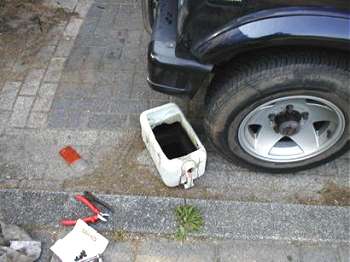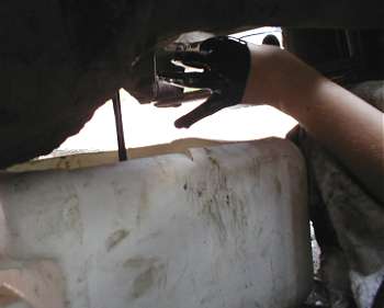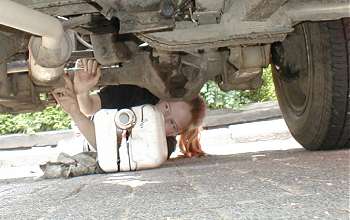 Als je die bout gevonden hebt draai hem dan los met een passende sleutel. Juist ja: de sleutel die je kwijt bent..... Zorg er wel voor dat er iets onder de auto staat om de olie op te vangen. (Het afwasteiltje van je moeder bijvoorbeeld) Helaas kom je daar meestal pas achter als je de aftap bout los hebt. |