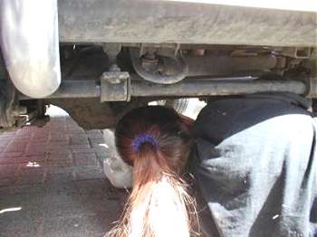 Hier zie je een trotse Claudia met het los gekregen oliefilter. Je dient voordat je het filter gaat vervangen wel een nieuwe (nuuwt voor de brabanders onder ons) in bezit te hebben. Voor zo'n filter ga je naar de suzuki dealer als je geld teveel hebt of anders naar de automaterialen zaak. Je vraag daar aan de magazijnman of verkoper een "oliefilter" voor betreffend voertuig. Op zijn beurt gaat betrokkene je dan chassis nummers en type nummers vragen. Niet in paniek raken, da's gewoon interessant doen. Alle oliefilters voor een suzuki 1300 zijn hetzelfde. |