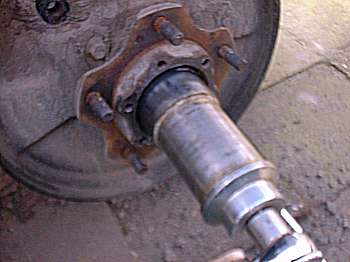 Nu kun je de eerste centrale moer losdraaien (maat: 50!) Ik doe dat hier met een dieper gemaakte dopsleutel maar het kan ook met een grote waterpomptang of d.m.v. een hamer en beiteltje (voorzichtig lostikken) |